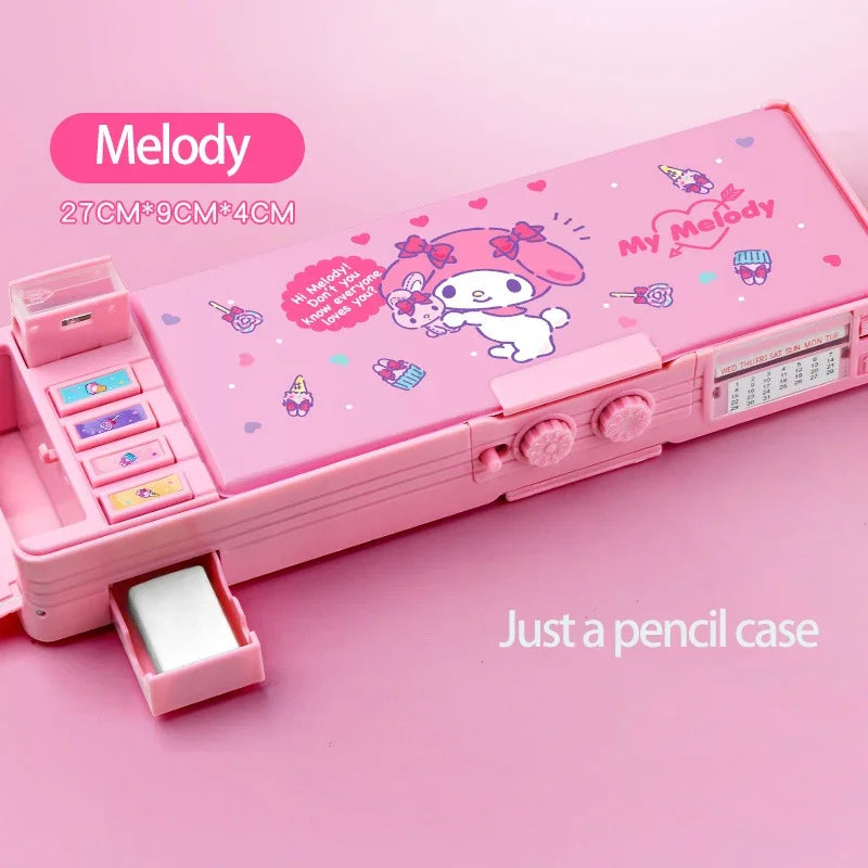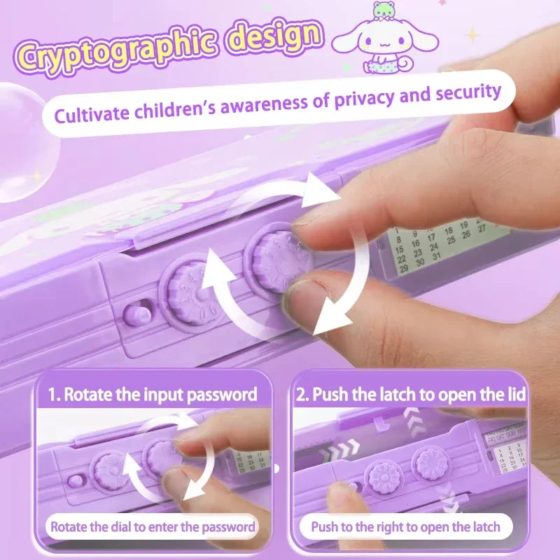 • Sanrio Multifunction Stationery Box Kuromi Melody Cinnamoroll Bilayer Coded Lock Pencil Box Large Capacity Students Supply Gift